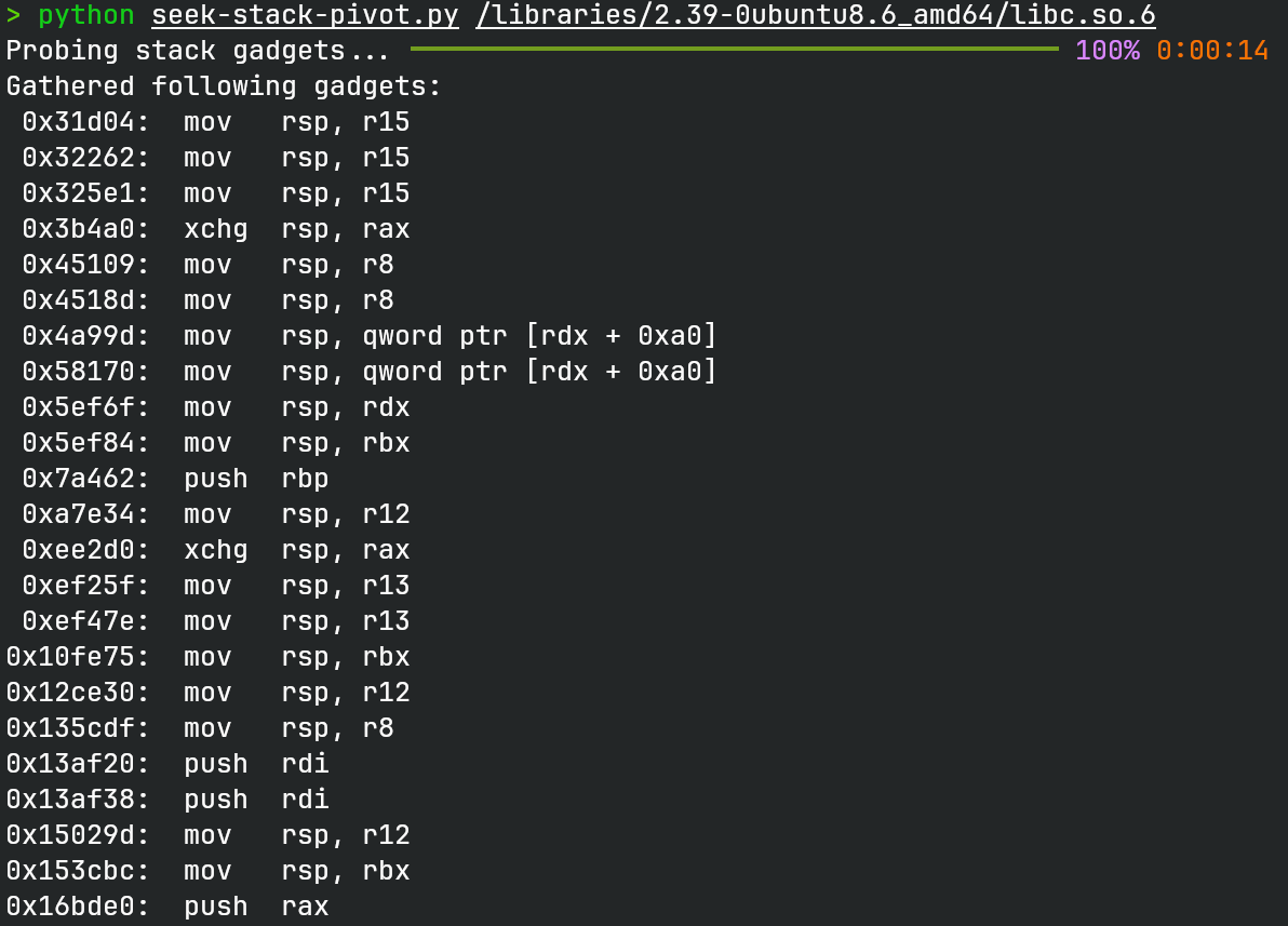 写了一个调用capstone的脚本来找,看起来gadget很多,但其实能用的不多。