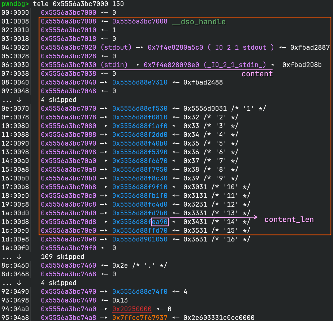 首先我们能泄露__dso_handle,然后如果我们能控制这个假file的content_len,就可以泄露更多数据。